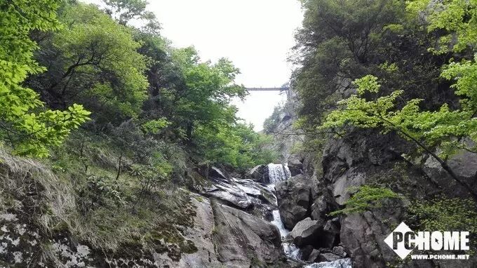 山涧飞流直下,形成小小的瀑布,水流清澈而凉爽。